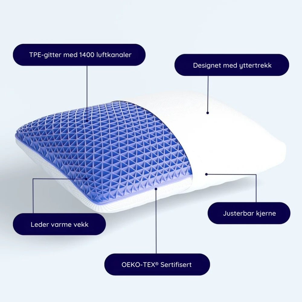CoolRest™ unike bikubemønster gjør at luften fritt kan strømme gjennom puten og effektivt leder bort overskuddsvarme. Sov kjølig og uforstyrret hele natten.