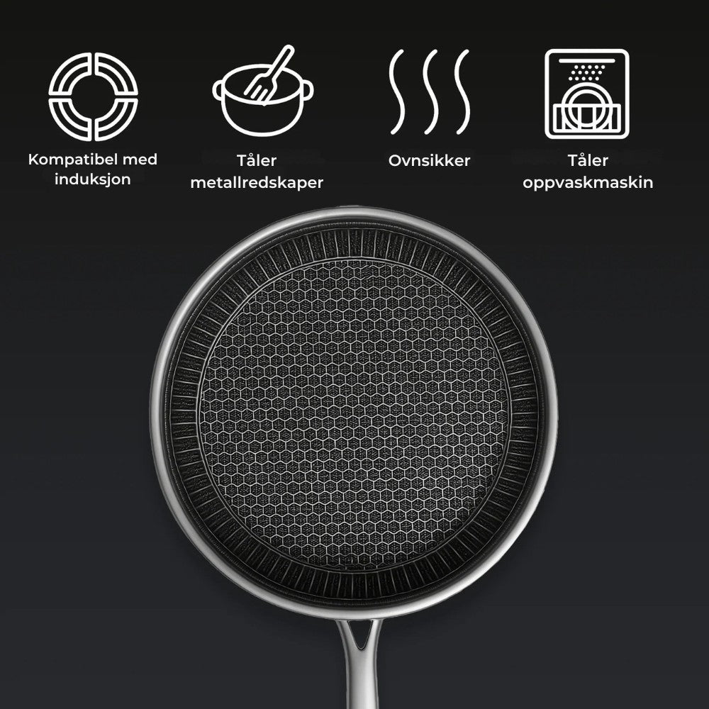PureClad har en trippellags konstruksjon som kombinerer rustfritt stål, støpejern og vår oppfinnelse NovaShield. De hevede stålsekskantene gir overlegen stekekraft, kombinert med NovaShield-daler, et keramisk lag med non-stick-egenskaper som sikrer enkel slipp – uten behov for skadelige kjemikalier. Vårt hybrid-design gir deg holdbarheten til rustfritt stål og bekvemmeligheten ved non-stick-matlaging. Kompatibel med alle koketopper, inkludert induksjon. PureClad er laget for langvarig ytelse og enkel rengjøring.