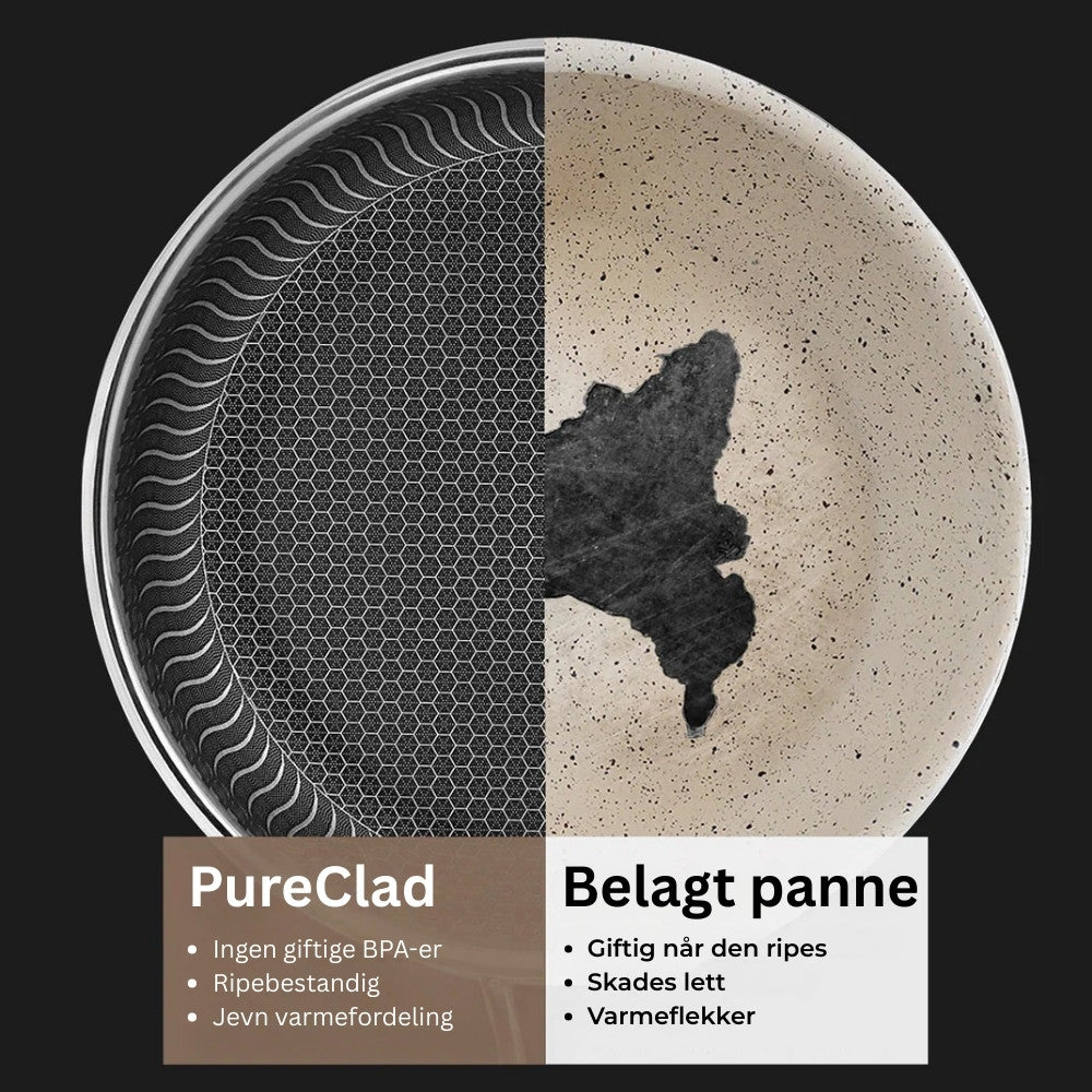 De fleste panner tvinger deg til å velge mellom ytelse og sikkerhet. PureClad leverer begge deler. Rustfritt stål er sterkt, men maten setter seg fast og krever teknikk. Støpejern holder godt på varmen, men er tungt, reaktivt og krevende å vedlikeholde. Tradisjonell non-stick? Enkelt, helt til belegget begynner å flasse og du ikke vet hva som havner i maten din.